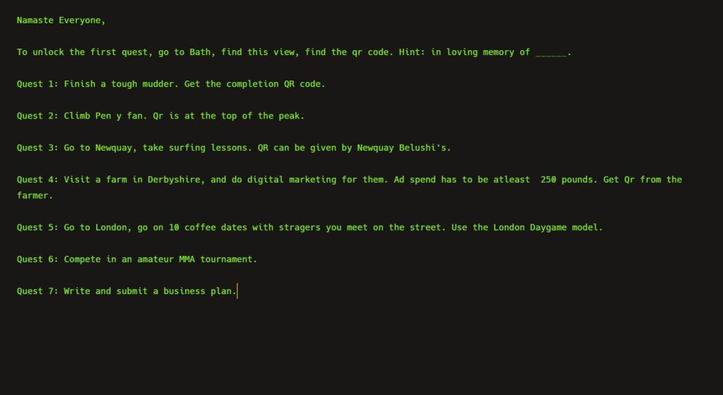The platform will be a game for students who have just finished their A levels and are considering taking a gap year. The game involves finishing 7 quests. The winner gets 100,000 GBP. The entry fee is 100 GBP. This will enable the brand to be profitable from day 1.